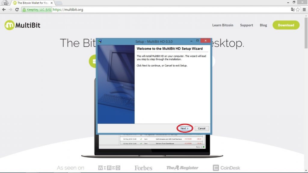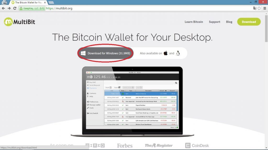 O primeiro passo é ir até o site da MultiBit e Clicar conforme mostra a imagem acima para fazer o download da instalação da carteira.