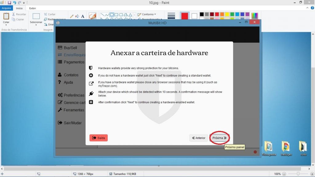 A tela seguinte trata sobre sua opção de escolher uma carteira de hardware. Carteira de hardware é um equipamento pouco conhecido que aumenta bastante a segurança de sua carteira de BTC. Mas o preço é um tanto quanto salgado. Para o propósito deste tutorial vamos apenas pular esta parte clicando em “Proxima.”