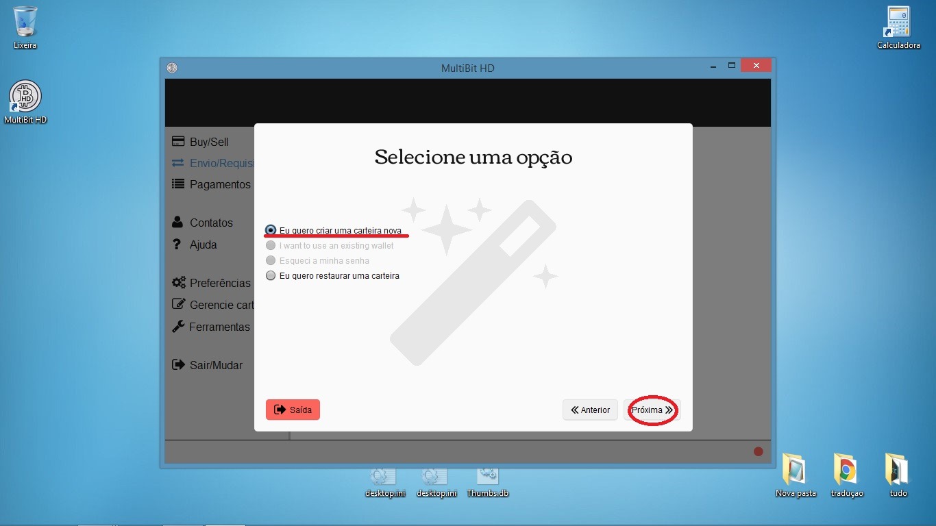 Agora, vamos começar efetivamente à criar nossa carteira de BTC novinha em folha. Marque a opção “Eu quero criar uma carteira nova” e clique em “Próxima”.