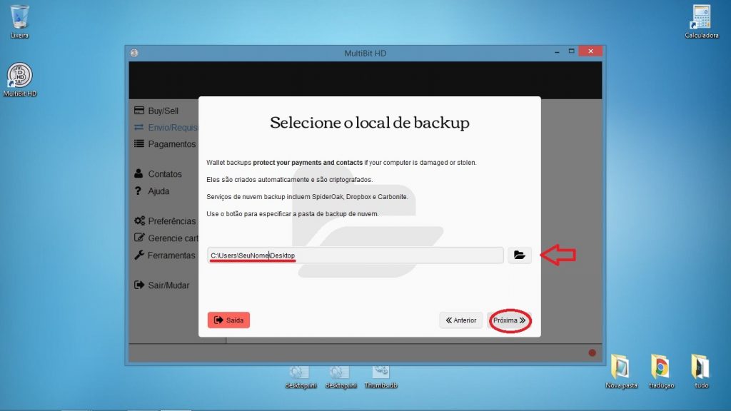 Após clicar próxima mais uma vez você encontrará a opção de escolher onde quer que a carteira salve seus backups. Você pode especificar que ela guarde seus backups, que incluirão seus contatos e pagamentos, até mesmo em algum serviço de nuvem. Mas não vamos nos aprofundar nisto agora, apenas escolha a pasta de sua preferencia e vamos adiante. Clique em “Próxima”.