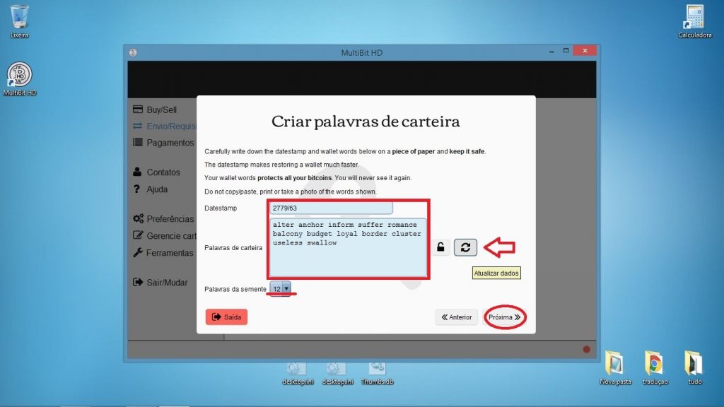 Agora temos uma parte crucial na criação de sua carteira. Na parte dentro do retângulo vermelho acima você verá que temos várias palavras, normalmente inglesas, que são basicamente uma senha para sua carteira. Mantenha o número acima e as palavras de carteira bem, muito bem guardadas, de preferência escritas em algum papel para que não perca, pois com eles você pode acessar sua carteira de qualquer lugar. Tendo anotado, clique em “Próxima”.