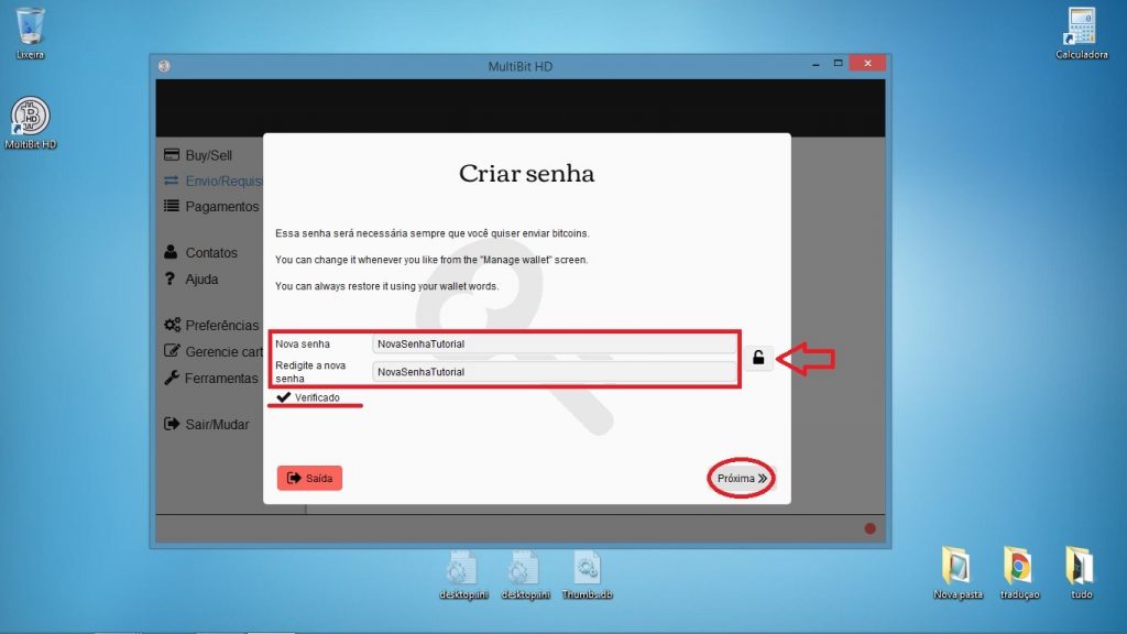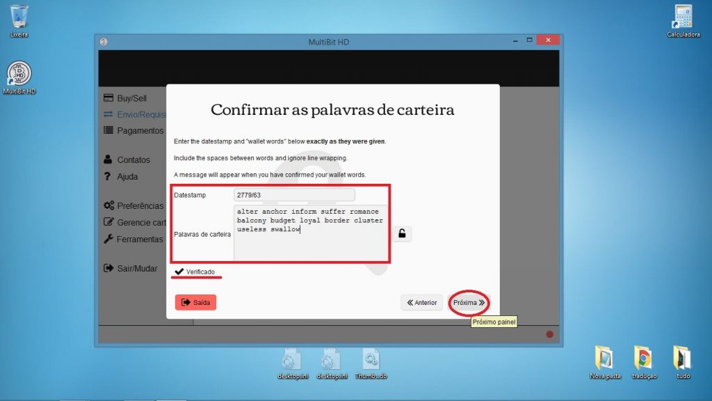 Eis que agora você já vai utilizar o Datestamp e as Palavras de Carteira que acabou de anotar. Digite ambos no seu devido lugar, espere aparecer escrito “Verificado” e vamos prosseguir.