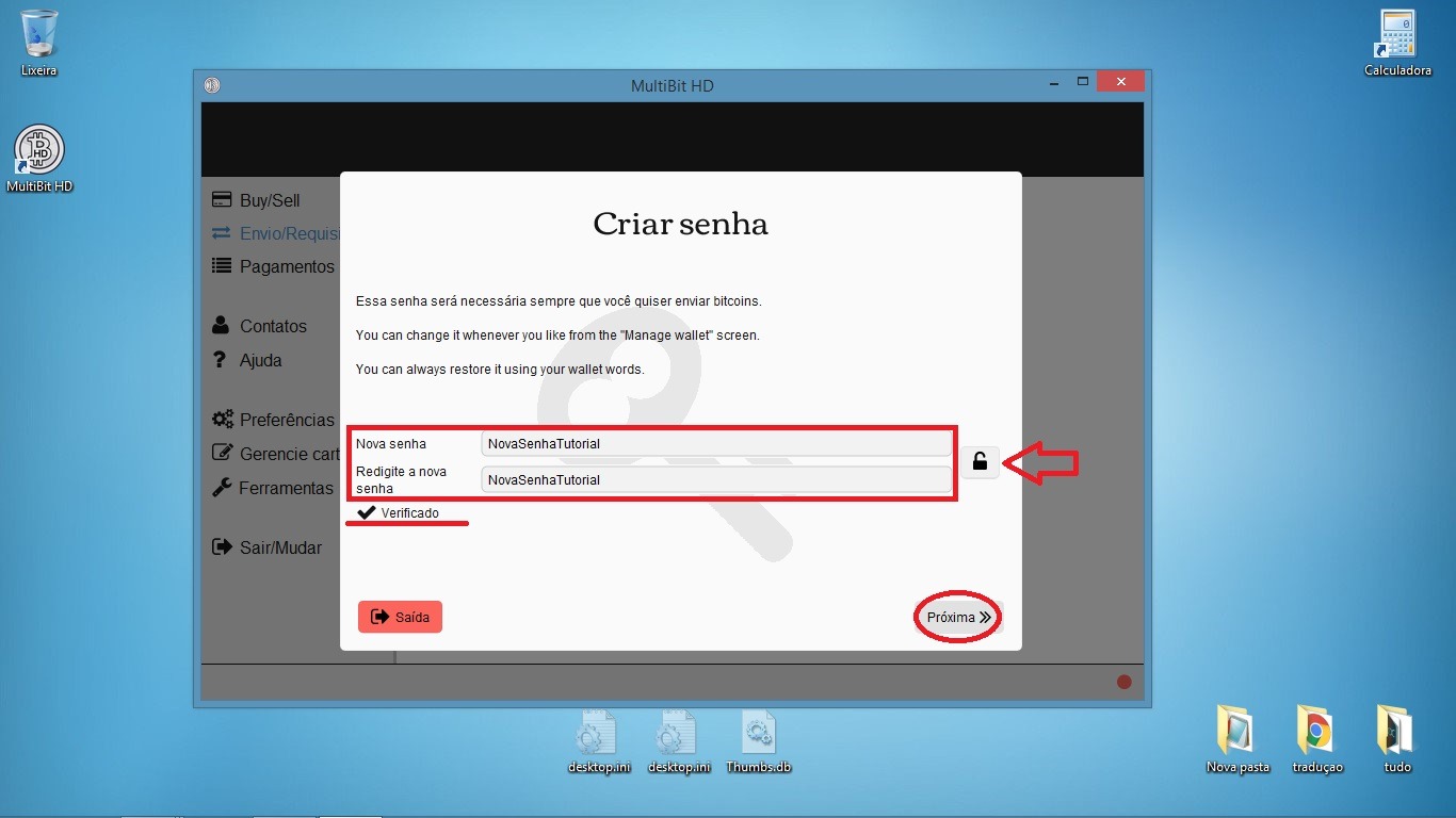 Nesse momento você define sua senha. Crie uma senha que seja fácil para que você se lembre mas ao mesmo tempo segura, pois toda vez que vá enviar BTC de sua carteira, ela será pedida pelo programa. Feito isto, clique em “Próxima”.