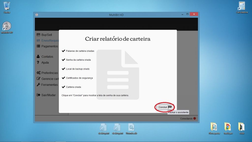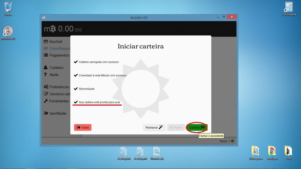 Tendo posto a senha correta, agora sua carteira está pronta para uso! Clique em “Concluir” e vamos adiante.