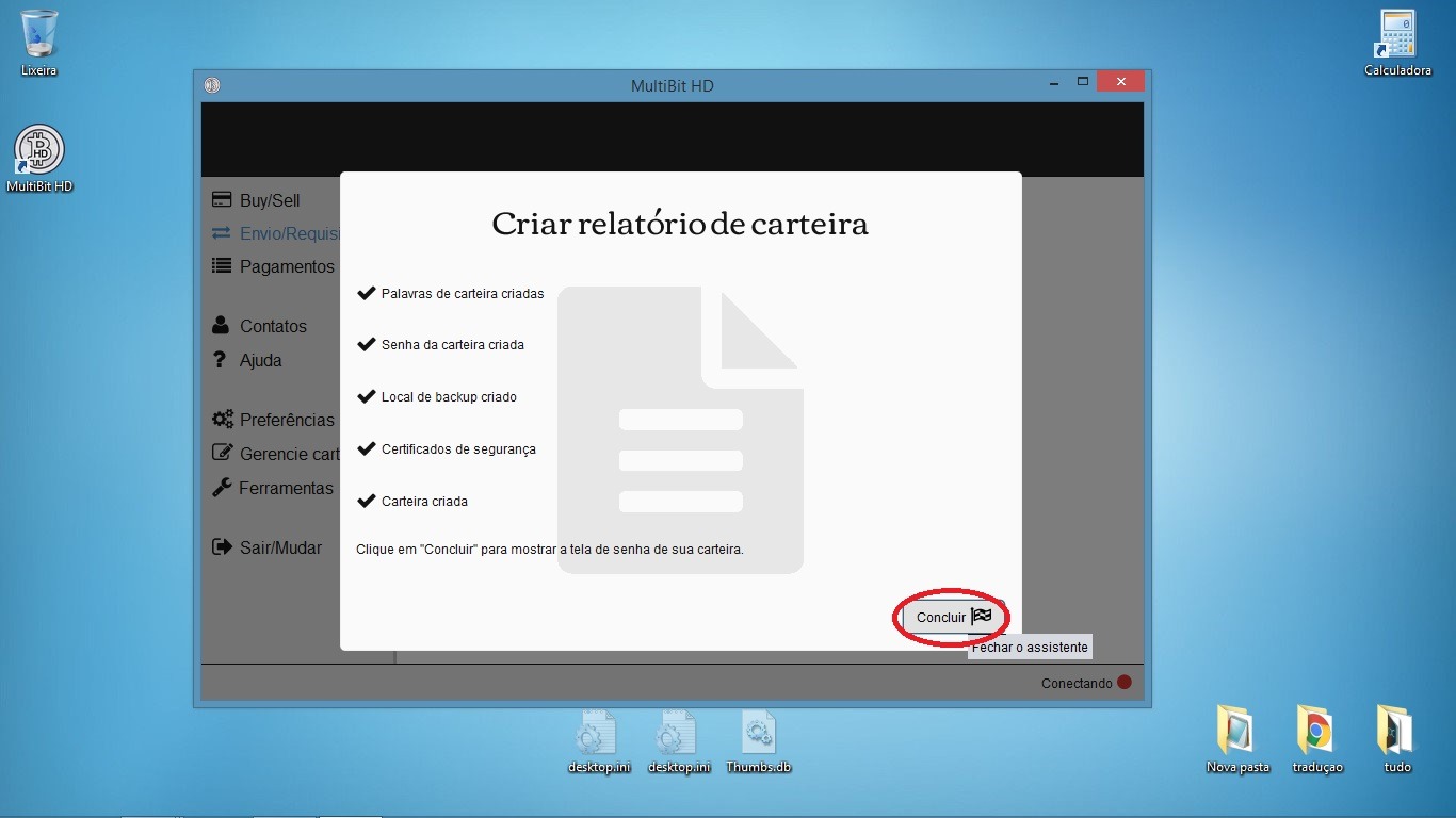 Continue seguindo a instalação até que a mesma termine e clique em “Finish”. Então agora pode ir para sua área de trabalho e clicar no ícone MultiBit HD.