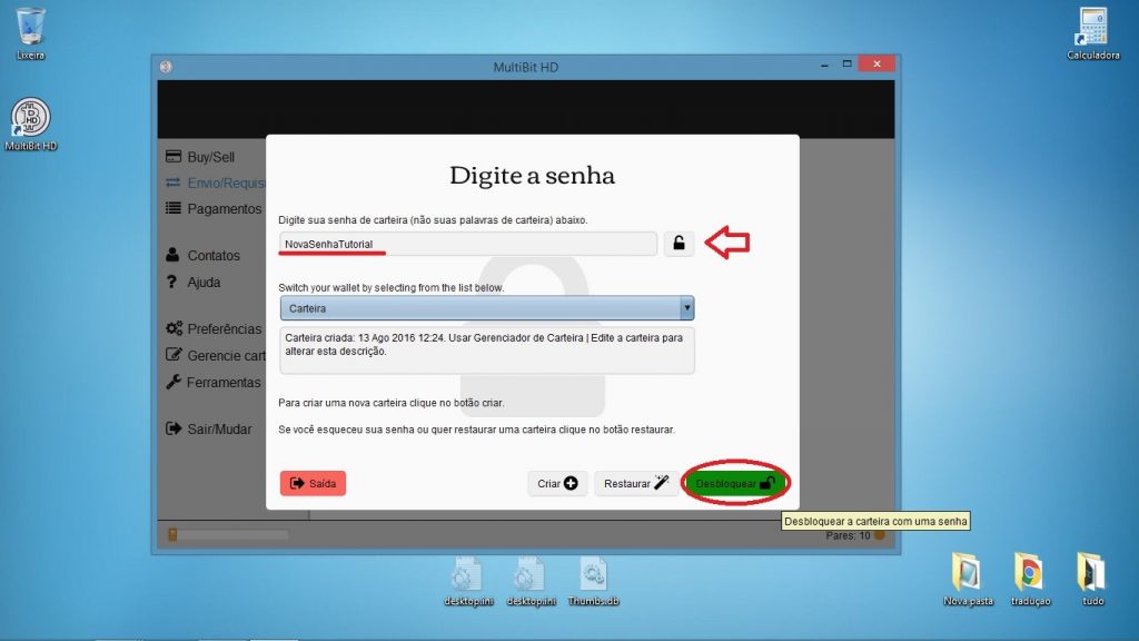 Nesse ponto o programa vai te pedir a senha, aquela mesma que acabou de digitar, para desbloquear a carteira. Este procedimento será necessário toda vez que acessar sua carteira.