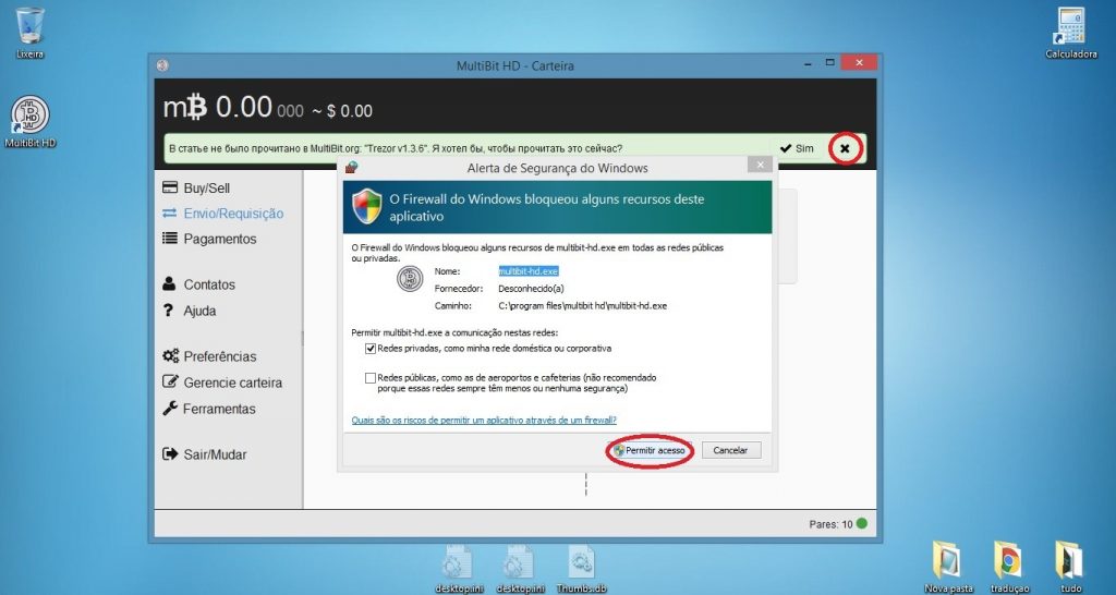 Na última versão da MultiBit HD, vai aparecer algo escrito em Russo, mas não é nada importante para o momento, então não se preocupe, e apenas clique no “X” para fechar esse aviso.